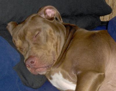 Buddah is my 4yr old chocolate brown pitbull nicknamed chocolate bar by my dad. I first saw Buddah at the Branford animal shelter in Branford ct.on October 2006. I was dropping off blankets & toys that belonged to my 1st pitbull Cysco who had to be put to sleep in Sept 2006 for a tumor which just devastated me. While i was at the shelter i went into the dog room & was just looking around at all the poor dogs who needed homes i look down one row & turned around to see the dogs on the other side on the kennel & there he was this absolutely beautiful brown boy. He was just sitting there looking at me with the saddest face not jumping not barking just sitting there i swear he looked like he was gonna cry any minute. I asked the warden about him she told me he was picked up & ended up at the kennel & this was the second time he was there & he was only 9 months old. He had gotten loose 2 times & the warden picked him up. The owner was suppose to pick him & just left him there. I went up to him & started petting him & he was just kissing me & i fell in love with him & asked if he was up for adoption she told me they were trying to get the owner to surrender him & then he would be. I gave my name & number. Well a few weeks later the warden called me & said are you still interested in Buddah? i said yes i am. The next day i brought my other dog punkin shepard golden mix to the shelter to meet buddah. Well the first year was really tough Buddah peed & pooped all over my house. We would take him out he would go & then come in the house & go again. To say the least, my dad was not happy at all. But then he just stopped going in the house after about a year of doing it. Buddah was very confused i am sure he didn't know if this was gonna be his permanent home after what he had been through. I gave him lots of love & attention & he did the same. Well i lost my brother in 2008 & it has been very devastating for me if not for Buddah i don't really think i would have made it through everything. He is the sweetest most lovable dog you could ever ask for. He cuddles with me on my bed all the time. We go for nice long walks together he loves to go for ride with me even if it is just to the store. In the mornings when we wake up he rolls rite over for a belly rub. Sometimes when i go to work i can't wait to get home & see him he is just the best. I do worry sometime because for some reason he doesn't seem to like other dogs he likes our punkin but no other dogs. So walking sometimes is tough but i handle him well. I am just so lucky to have him & would have 10 more pitbulls if i could they are the best dogs you could ever ask for. I have had about 10 dogs in my life but my pitbulls were the best. I love him very much!!!!!!