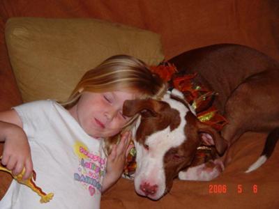 Izzy is an endlessley entertaining girl. She is sweet and brilliant. We call her the evil genius. She can let herself out of crates, unzip purses and make ladders out of dining chairs. Recently she climbed one of her home made ladders and got the peanut butter. When I came out of the shower she was happily eating it just like a kong in the middle of the bedroom floor. I said " Izzy I think you have had enough" and she happily gave me the rest of the jar. Izzy came from the worst of circumstances with the friendliest, sweetest disposition of any dog I know. She regularly does childrens events for the Humane Society where I work. Click here to read or post comments Return to Pitbull pictures archives December 2009 thru June 2010. Your donation in any amount can help us reach out to more people who want to know the truth about pit bulls. Thank You for Your Support! Return to Pit Bull Homepage |