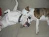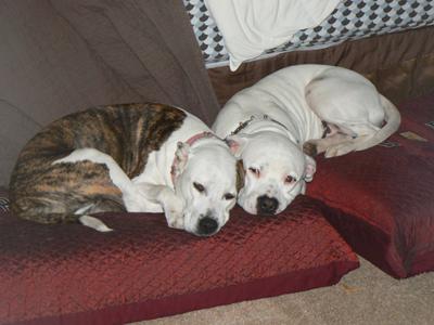 The Love of My Life #1: Bella aka Bella Donna, Donna, Momma Donna, The People’s Donna, Belley, Bellita, Baby Girl, Belle, Mrs. Davidson and Grandma’s favorite Southern Belle. I rescued Bella from someone who didn’t want her anymore. I believe that the person might have been trying to train her for dog fighting but realized that she didn’t have the fight drive and thought she was too small. He did a backyard job on her ear crop and it took a year after I got her for her ears to finally heal completely. The whole time I was pulling out sewing thread from her ears (yes, regular old sewing thread. They didn’t even bother to use medical grade stitching thread) and cleaning out the infections. My poor baby hardly ever yelped and she toughed it out like a soldier! It did take her close to 6 months to trust me and another 6 months to even think about trusting strangers. Now, she loves meeting new people and giving them love. She definitely has changed my neighbor’s views about pit bulls and they all love her. Bella is the 40 pound love bug of the pair and always cuddles with momma when I’m not feeling well, am sad, or just want to take a nap. Bella’s number one talent is giving her angel eyes; they make the hardest heart melt. The Love of My Life #2: Harley aka Fat Boy, Fat Kid, The Nutless Wonder, Har Har, Har, Oh Harley, Mr. Davidson and Grandma’s favorite Harley Barley Marley. I “rescued” Harley when he was 6 months old. I say “rescued” because Harley actually came from a good family that was training him and loved him dearly but when their landlord came to their house to pick up rent, he told Poor thing, by the time I got him he had been passed through 3 other homes and in the confusion they didn’t keep up with his shots. By the time he made it to my house, I had him for a month before he got parvo. I played nurse and he toughed it out and after I nursed him through the Parvo he knew that he could trust me. He’s the 65 pound goof ball of the pair and makes everyone that meets him laugh. Harley’s number one talent is licking his non-existent balls and sun-bathing his belly spread eagle. The Affair: Bella and Harley are like peas and carrots. Where one goes, the other goes and vice versa. I never knew that the relationship between dogs was so intense and beautiful before I got them. They absolutely love each other and can not be without each other. When Harley had parvo, he wanted to be as close to the sliding glass door as possible because Bella was outside and they spent the whole time lying next to each other, across the glass. They lick each other silly! I’ve never seen dogs make out like my dogs do. Bella is definitely the alpha of the pair, although she allows Harley to get away with a lot. They play non stop all day long but at the end of the day, they cuddle together for bed. I could not imagine my life without the two. They make me laugh and they bring me comfort. They are the most lovable, cuddly, kissable, caring, sensitive, playful, funny, and amazing dogs I’ve ever had.