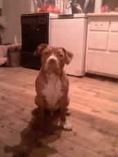 My name is Aubrey and this is my pit bull family. I'm a stay at home mom of 3 great kids (all under the age of 9). My husband Rick and I got our first pit bull 3 years ago. Her name is Ava. Ava is solid white with a brown diamond patch of chocolate over her right eye she was found in a ditch at 1 week old by a friend and came to live with us at 5 weeks, she was the smallest little baby, so cute. Now she is 3 and the best dog ever. The funniest thing she does, and has some how taught our other 3 to do, is roll over on her back and just kick her back legs like crazy. We call it the Woo Woo Dance! I couldn't imagine my life without her. Ava was the first pit bull in our entire family and now just between our parents and brothers and sister we now have about 10 full blooded pit bulls and we love every single one of them! All of this is thanks to Ava, she has changed so many minds about pit bulls, that family members that said they would never have a pit now do, and I love it. This is the best breed ever!! Our second is Capone, he is a solid very light, blue fawn...so beautiful. He is really cheesy, loves to jump on the trampoline with the kids and do the army crawl, he can do that all day. We got him from a very good breeder so we had no problems with him. The funniest thing is does is SMILE!!! All teeth showing, running full force at you. He has scared a lot of people, but once they know he is just smiling they cant help but love him, and he loves everybody just as much. He's a momma's boy too. The other 2 are babies that Ava and Capone had together, now 1 year. Frankie is our crazy, full of energy and kisses, loves to give kisses. He is a red fawn and a very big boy, another momma's boy. And last but not least, is our little miss Khloe. She is a solid chocolate with white chest and white toes. She is the runt of her litter and only stands about 15 inches tall, if that. I call her momma's lil left over's. For a long time we didn't think she would grow. But now she funniest looking pit ever. My sister says she has shrek ears and an Elvis grin. The Elvis grin she has, only seems to get one side of the lips up. Return to Pitbull pictures archive August 2010. Your donation in any amount can help us reach out to more people who want to know the truth about pit bulls. Thank You for Your Support! Return to Pit Bull Homepage |