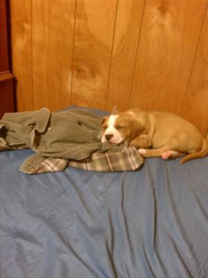 My entire life I have had a negative connotation towards Pit Bulls. It was not out of a fear of larger dogs, my entire life having owned Great Pyrenees-I had just heard too many negative things about the breed. Ever since we started dating, my girlfriend told me these amazing stories about her previous Pit Bull Rocky and how he would hear the term "Super Dog" and would come running and allow her to put on "his cape and battle helmet" and she'd latch on to him and off they would go. As fate would have it I went over to a friends house for dinner, and sure enough he had a litter of pit bull pups. Holding 2 day old Roxie in my hand was all I needed to have my mind changed, and the rest is history. She is currently 7 weeks older and getting bigger and more amazing every day. I guess we ended up with another "super dog" of our own. She sleeps in bed, already knows to go to the door when she needs to go out, and is the most playful puppy we've ever owned. The only downside is on occasion she is a little gassy though. Hah, all 'n all, we couldn't own a sweeter dog.